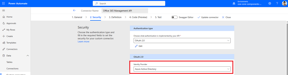 Vai a Power Apps>Dataverse>Connettori personalizzati. Il connettore personalizzato dell'API di gestione Office 365 è elencato qui. Il connettore viene importato con la soluzione dei componenti principali.