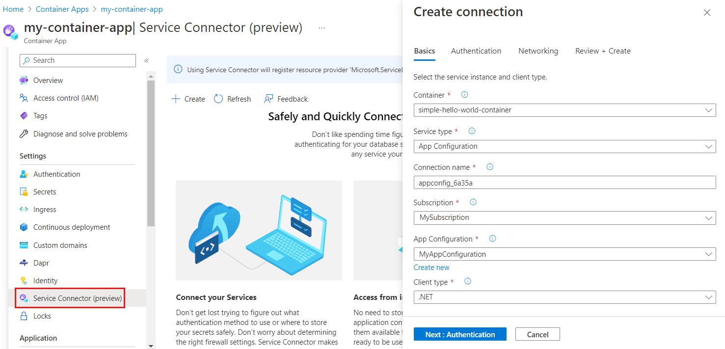 Screenshot della piattaforma Azure che mostra un modulo nel menu Connettore di servizi in un'App contenitore.