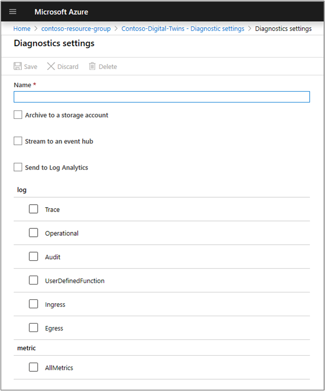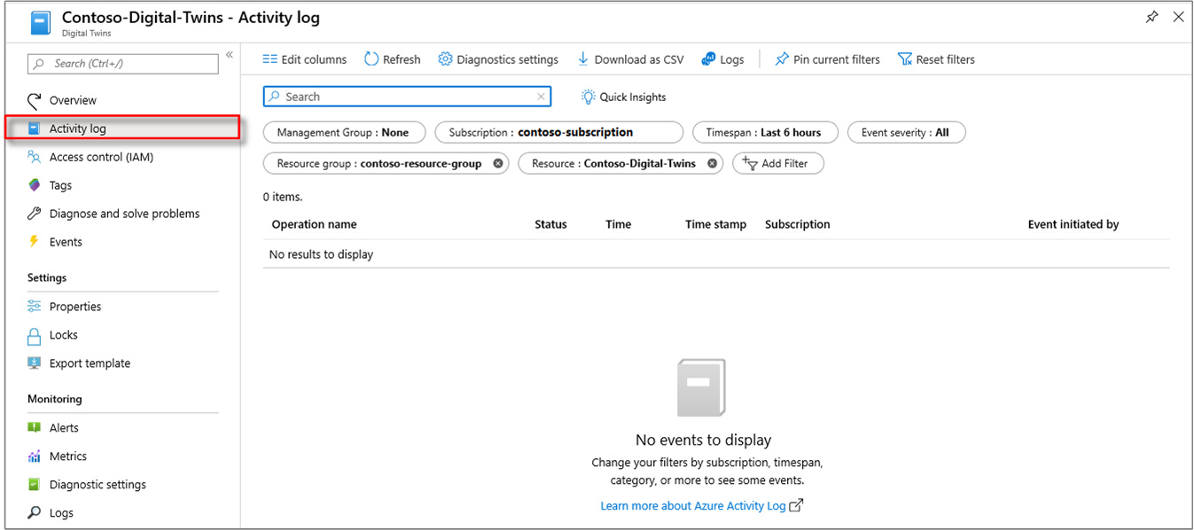 La registrazione delle attività per Gemelli digitali di Azure è abilitata per impostazione predefinita ed è disponibile tramite il portale di Azure: