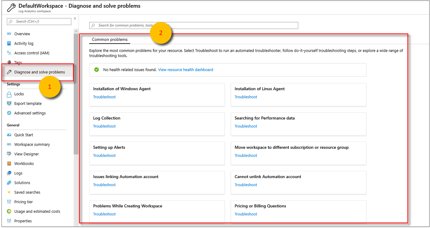 I log di Monitoraggio di Azure forniscono anche potenti servizi di notifica degli errori e degli avvisi, che possono essere visualizzati selezionando Diagnostica e risolvi i problemi: