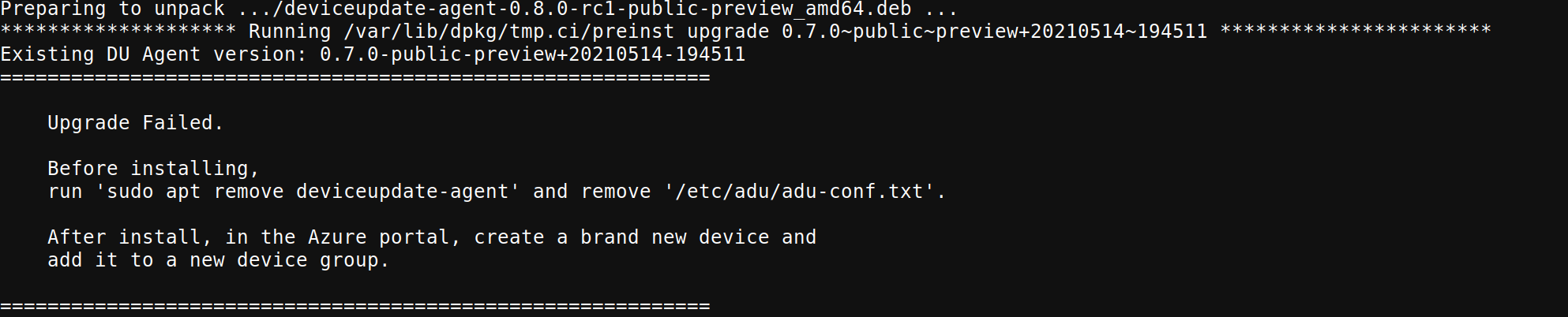 sudo apt install <file>.debIl tentativo di aggiornare l'agente di Aggiornamento dispositivi senza rimuovere l'agente precedente e i file di configurazione genererà l'errore riportato di seguito.