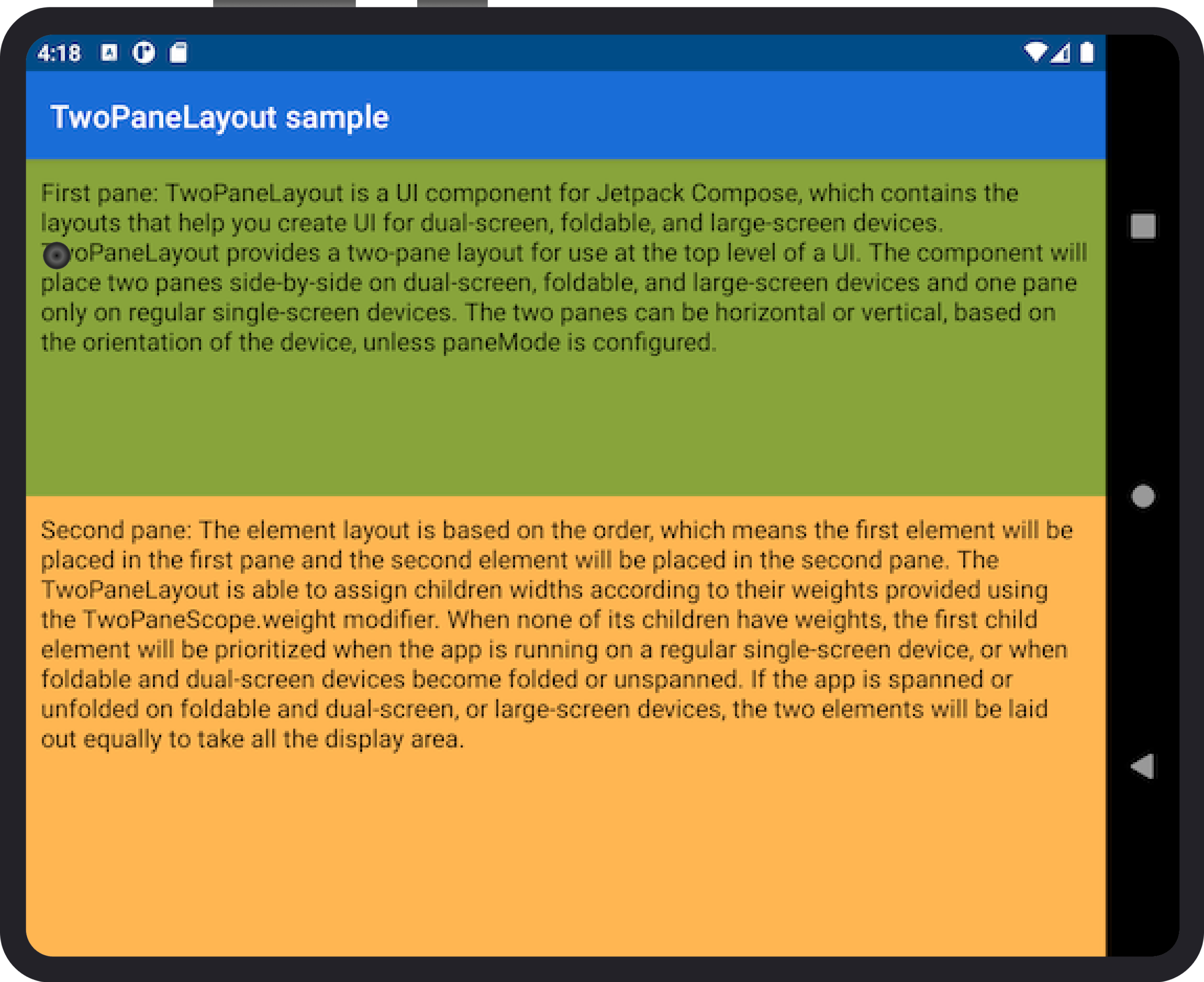 When the app is spanned across a separating vertical hinge or fold, or when the width is larger than the height of the screen on a large-screen device, pane 1 will be placed on the left, while pane 2 will be on the right. If the device rotates, the app is spanned across a separating horizontal hinge or fold, or the width is smaller than the height of screen on large-screen device, pane 1 will be placed on the top and pane 2 will be on the bottom.