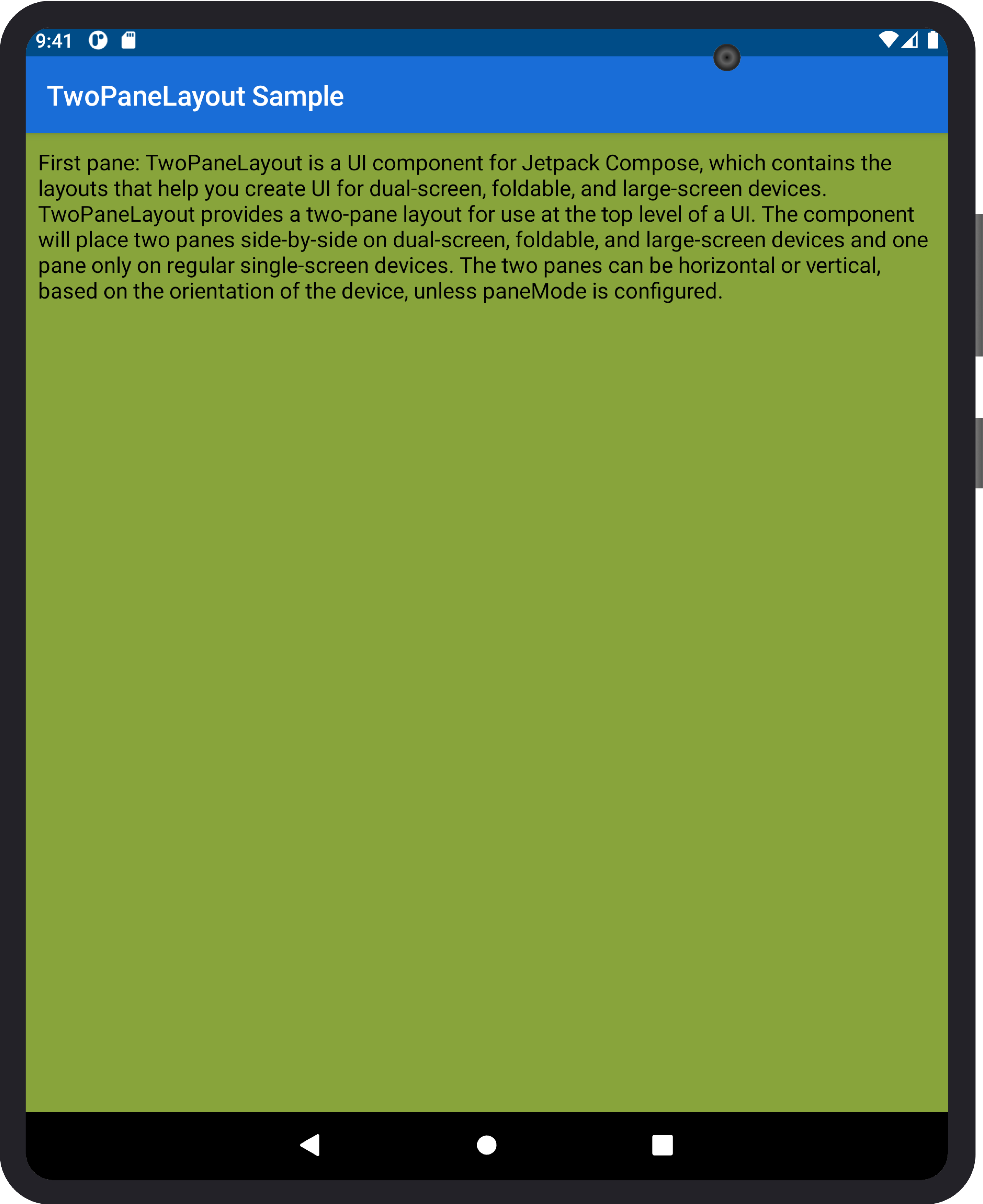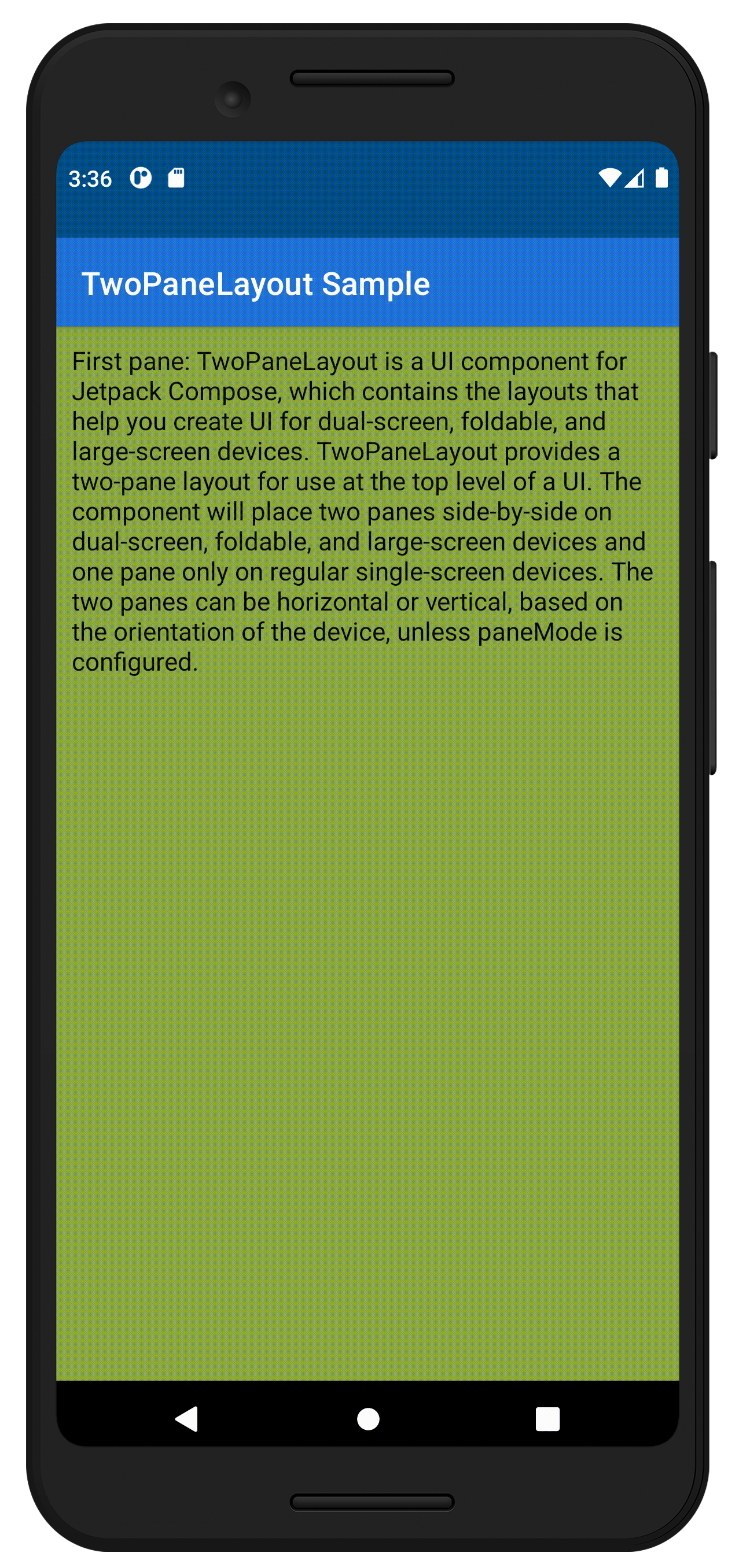 The pane mode affects when two panes are shown for TwoPaneLayout. By default, whenever there is a separating fold or a large window, two panes will be shown, but you can choose to show only one pane in these cases by changing the pane mode.