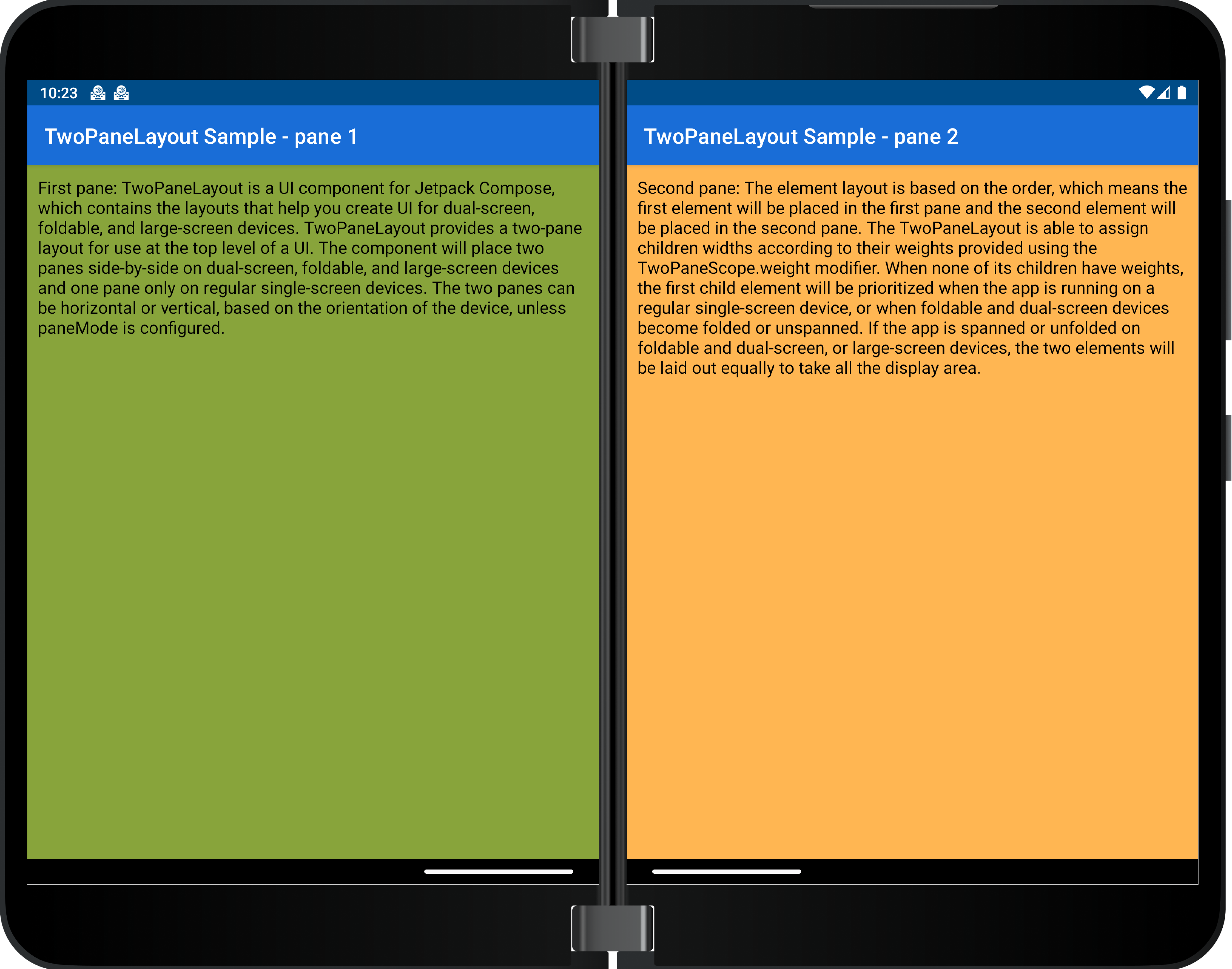 For instance, this image shows TwoPaneLayout layout on a dual-screen device, which has a separating fold: