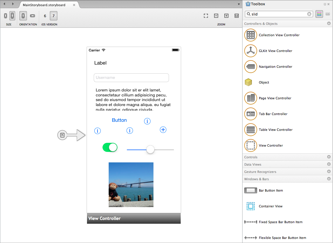 Per iniziare a creare l'interfaccia utente in iOS Designer, fare doppio clic su un file storyboard. I controlli possono essere trascinati nell'area di progettazione dalla casella degli strumenti , come illustrato di seguito: