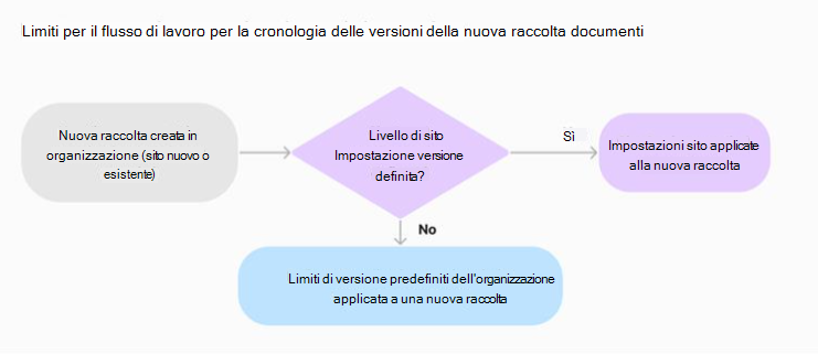 La figura seguente illustra il flusso di lavoro di applicazione di un limite di versione per le nuove raccolte documenti. Quando viene creata una nuova raccolta, viene eseguito il controllo delle impostazioni a livello di sito. Se non viene definita alcuna impostazione del sito, l'impostazione predefinita dell'organizzazione viene applicata alle nuove librerie.