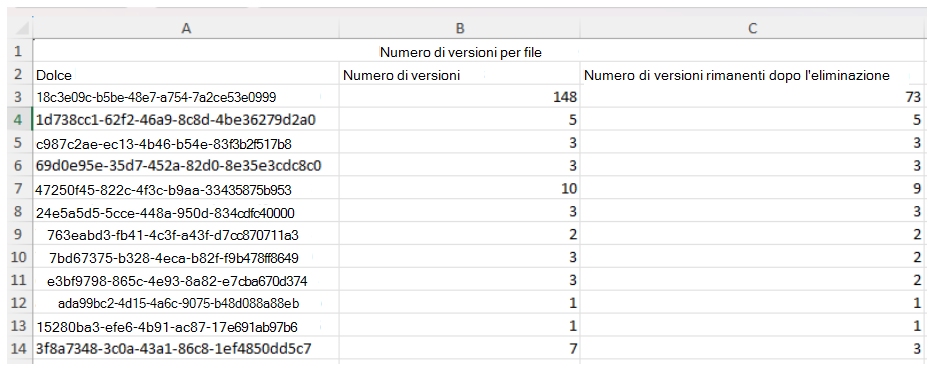 Nel foglio di lavoro Analisi a livello di file compilare automaticamente le colonne Numero di versioni e Numero di versioni rimanenti dopo l'eliminazione .