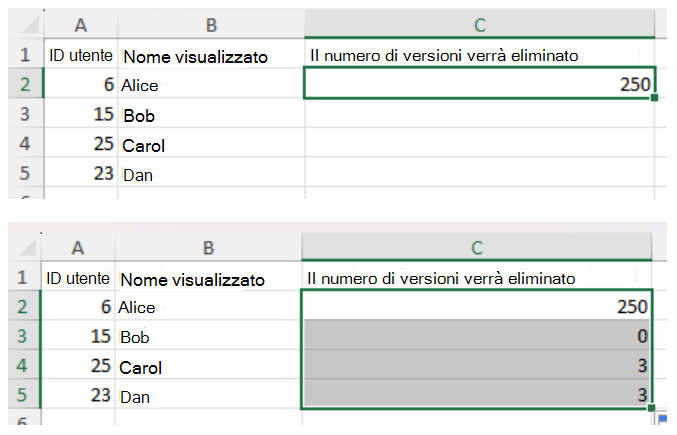 Nel foglio di lavoro Utenti interessati compilare automaticamente la colonna Numero di versioni da eliminare .