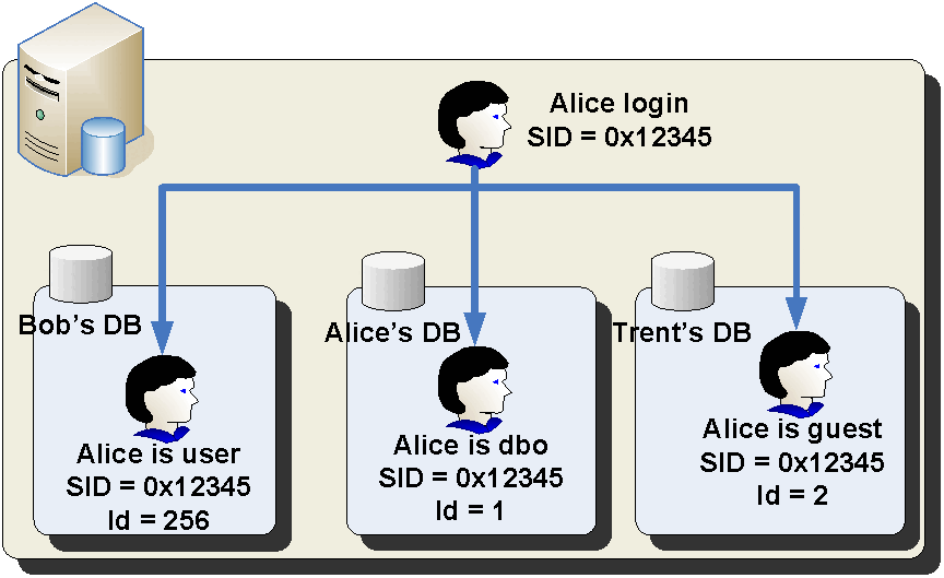 Il diagramma seguente mostra che un utente, Alice, ha un account di accesso a livello di server e tre utenti diversi mappati allo stesso account di accesso in ogni database diverso.