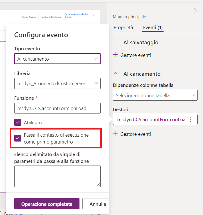 Quando si registra un gestore eventi, è possibile passare il contesto di esecuzione come primo parametro. Se si registra un gestore eventi usando le proprietà del modulo, è possibile abilitare questa opzione. L'immagine mostra la registrazione di un gestore OnLoad e l'abilitazione del contesto di esecuzione.