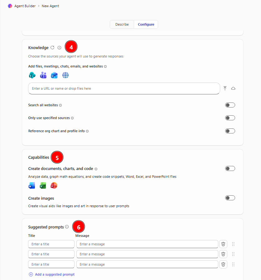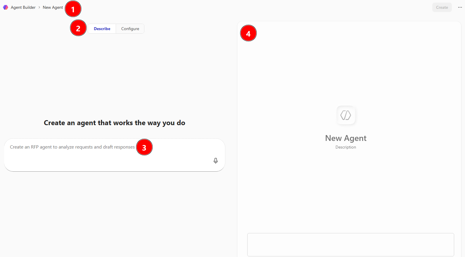 Dopo aver selezionato Nuovo agente, viene visualizzata una finestra simile al generatore di agenti del linguaggio naturale in Copilot Studio. La finestra Describe è la home page per definire e creare un nuovo agente in Copilot Chat. Queste sono le opzioni seguenti disponibili per la creazione di un agente in Copilot Chat tramite la schermata Describe:
