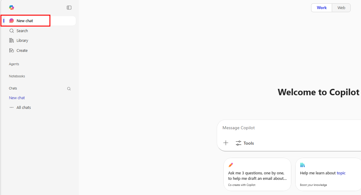 Nuova chat - La pagina principale di Copilot Chat, selezionando questa opzione, viene aperta l'agente chat di base Copilot che ha accesso ai dati Microsoft 365. Le richieste a questo agente si usano in particolare per argomenti che possono richiedere ricerche in pagine Web e includono dati pre-training di Microsoft 365 Copilot. La scheda Chat include tre sottolivelli selezionabili: