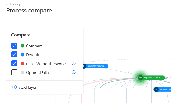 Tornare alla vista che include tutti i casi. Selezionare Confronto tra processi dal menu di spostamento a sinistra, quindi aggiungere la vista creata come livello. È possibile scegliere un totale di tre viste extra da aggiungere come livelli nel confronto. Inoltre, è possibile aggiungere livelli da un file BPMN (Business Process Model and Notation).