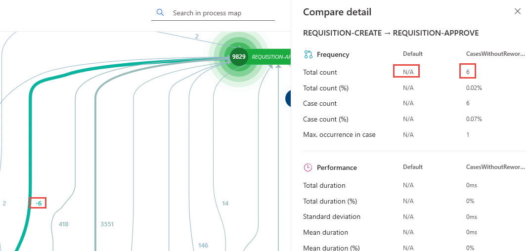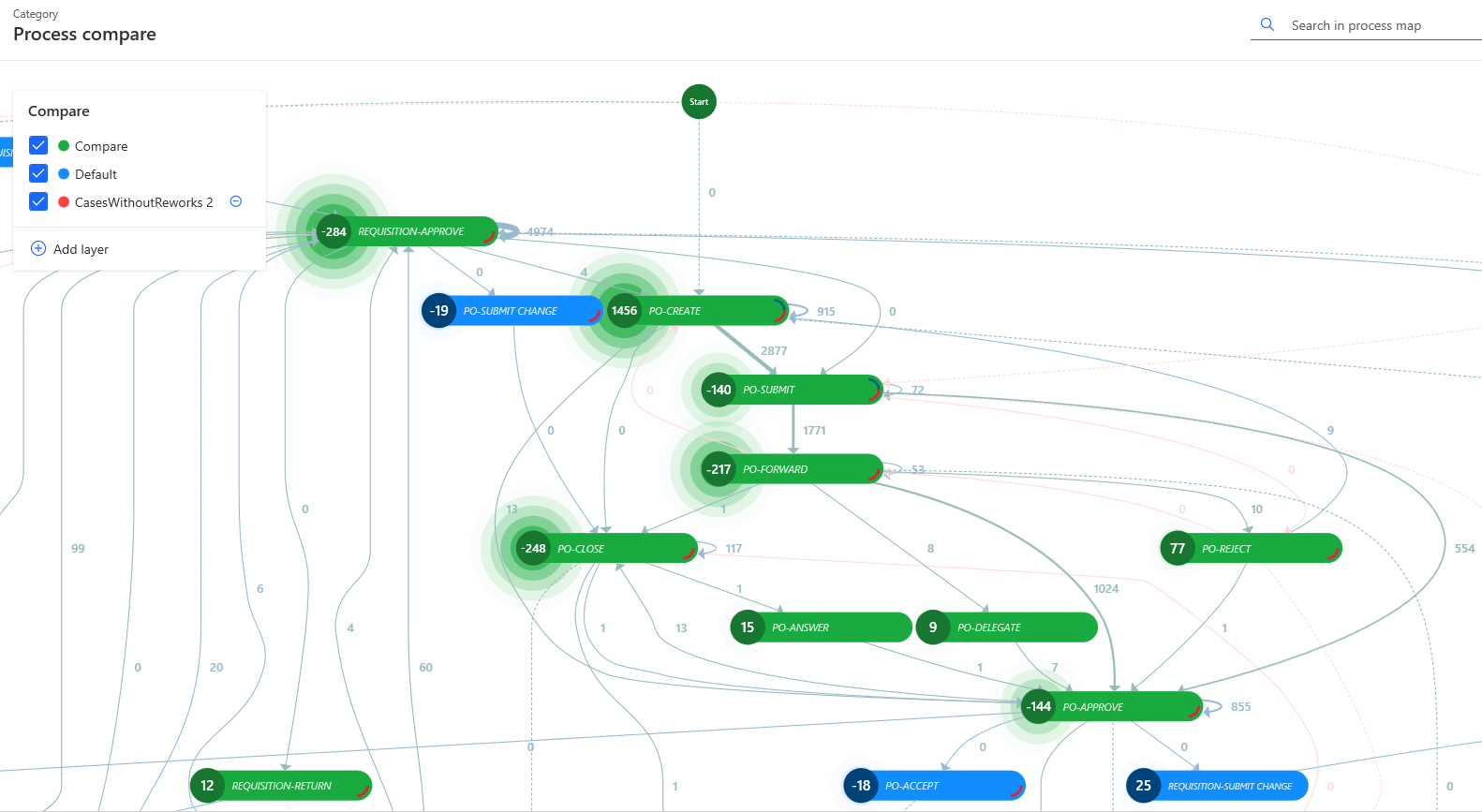 Il modulo Confronto tra processi consente di eseguire un paragone intuitivo ed efficiente dei processi. È possibile confrontare i processi a livello della mappa del processo, dove la visualizzazione generata permette di identificare con maggiore facilità le differenze nel flusso e nella frequenza o nelle metriche di tempo.