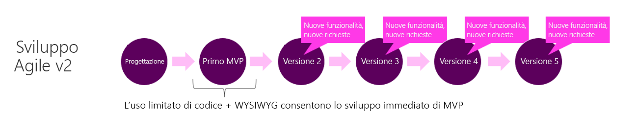 Con Power Apps è possibile creare rapidamente una versione utilizzabile dell'app perché Power Apps fornisce un'esperienza di sviluppo WYSIWYG (what you see is what you get). Già nelle prime fasi del processo di sviluppo è possibile lavorare sull'app funzionante e, in caso di nuovi requisiti, è possibile aggiungere nuove funzionalità alla versione successiva.