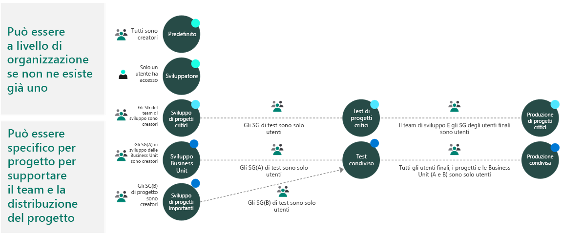 Svolge anche la funzione di contenitore per separare le app che possono avere ruoli, requisiti di sicurezza o destinatari diversi. La scelta di come usare gli ambienti dipende dall'organizzazione e dalle app da creare, ad esempio: