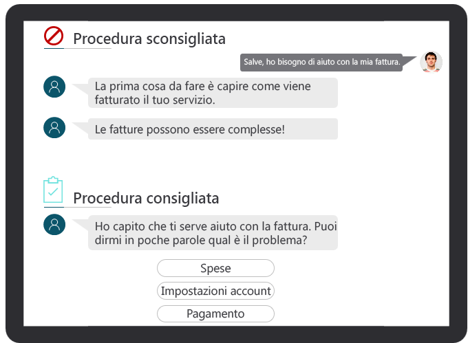 Non mettere fretta al cliente: quando l'agente risponde troppo rapidamente al cliente, quest'ultimo potrebbe fare fatica a tenere il passo. Potrebbe così sentirsi sotto pressione e percepire che le sue esigenze non siano tenute nella giusta considerazione. L'aggiunta di un ritardo minimo in punti specifici può fornire al cliente il tempo extra di cui ha bisogno per esaminare informazioni specifiche.