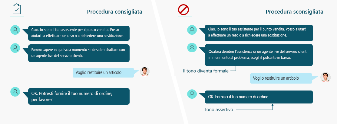Mantenere un tono coerente durante l'intera conversazione è fondamentale. Il tono generale della conversazione deve essere costantemente amichevole, soprattutto quando si aiutano gli utenti a completare delle attività. Questa affermazione non implica che non puoi si possa cambiare il tono in funzione del momento della conversazione. Al contrario, adattare il tono delle risposte dell'agente al contesto della conversazione è sempre una buona idea. Ad esempio, se la conversazione riguarda un argomento serio, come la fatturazione o la sicurezza informatica, è sì importante essere empatici ma soprattutto è importante essere brevi e diretti. L'agente sarà comunque percepito come amichevole perché è solidale con la situazione del cliente. Se si parla di un argomento più banale, come la creazione di un nuovo account, il tono può essere più rilassato.