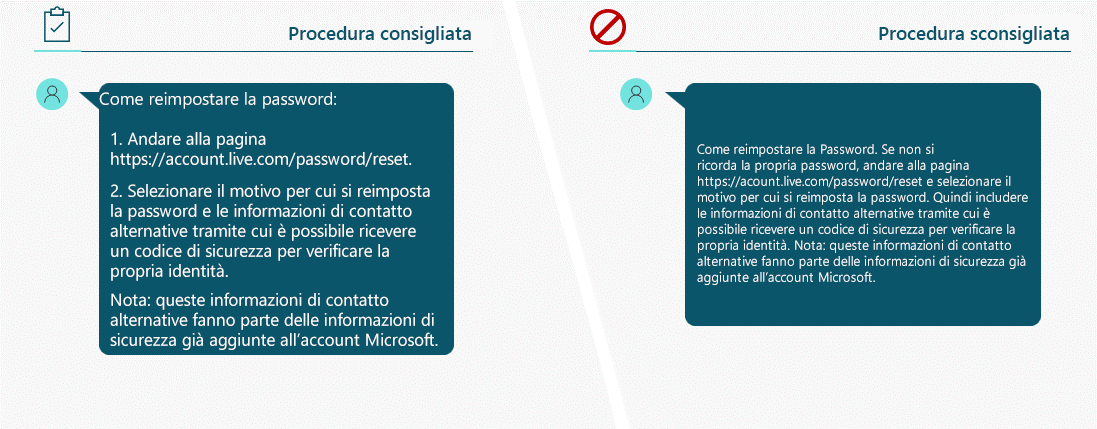 L'immagine seguente mostra due esempi che usano un articolo Come reimpostare la password tratto da siti Web. Il primo esempio divide gli elementi in blocchi di facile lettura, mentre il secondo esempio colloca il contenuto in un blocco difficile da leggere.