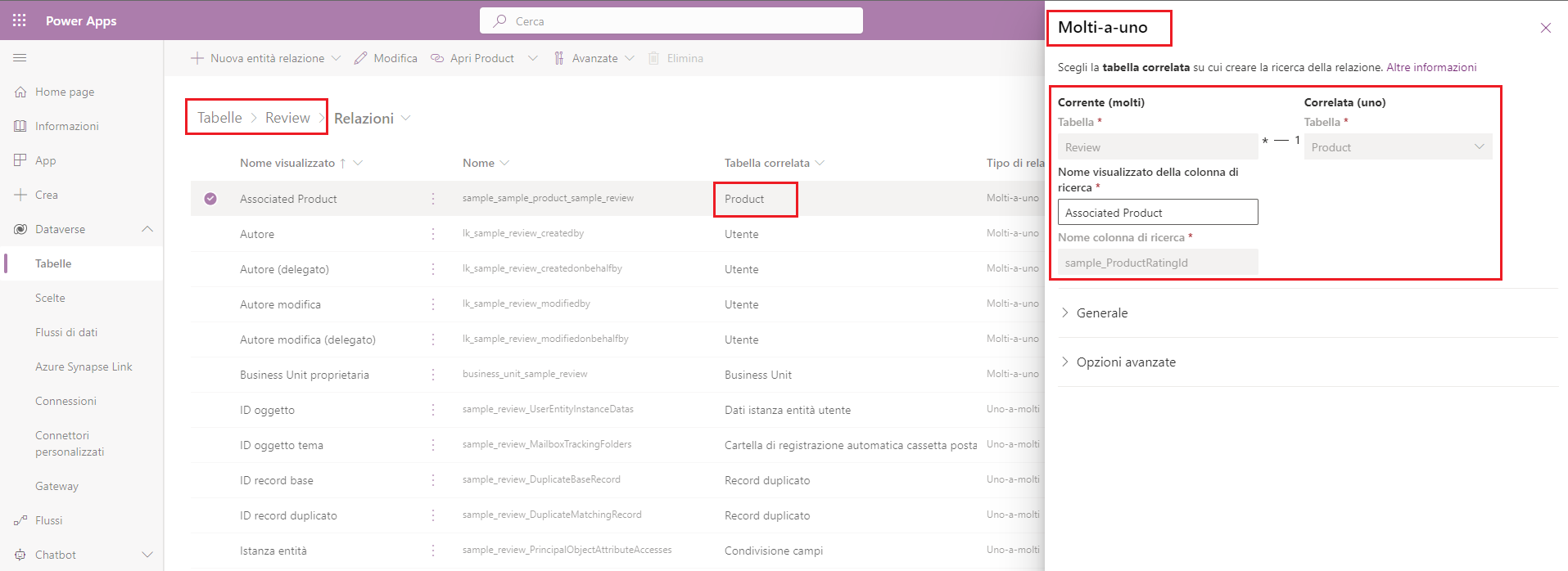Tra queste tre tabelle è stata stabilita una relazione. È presente ad esempio una relazione molti-a-uno per la colonna Prodotto associato tra le tabelle Review e Product.