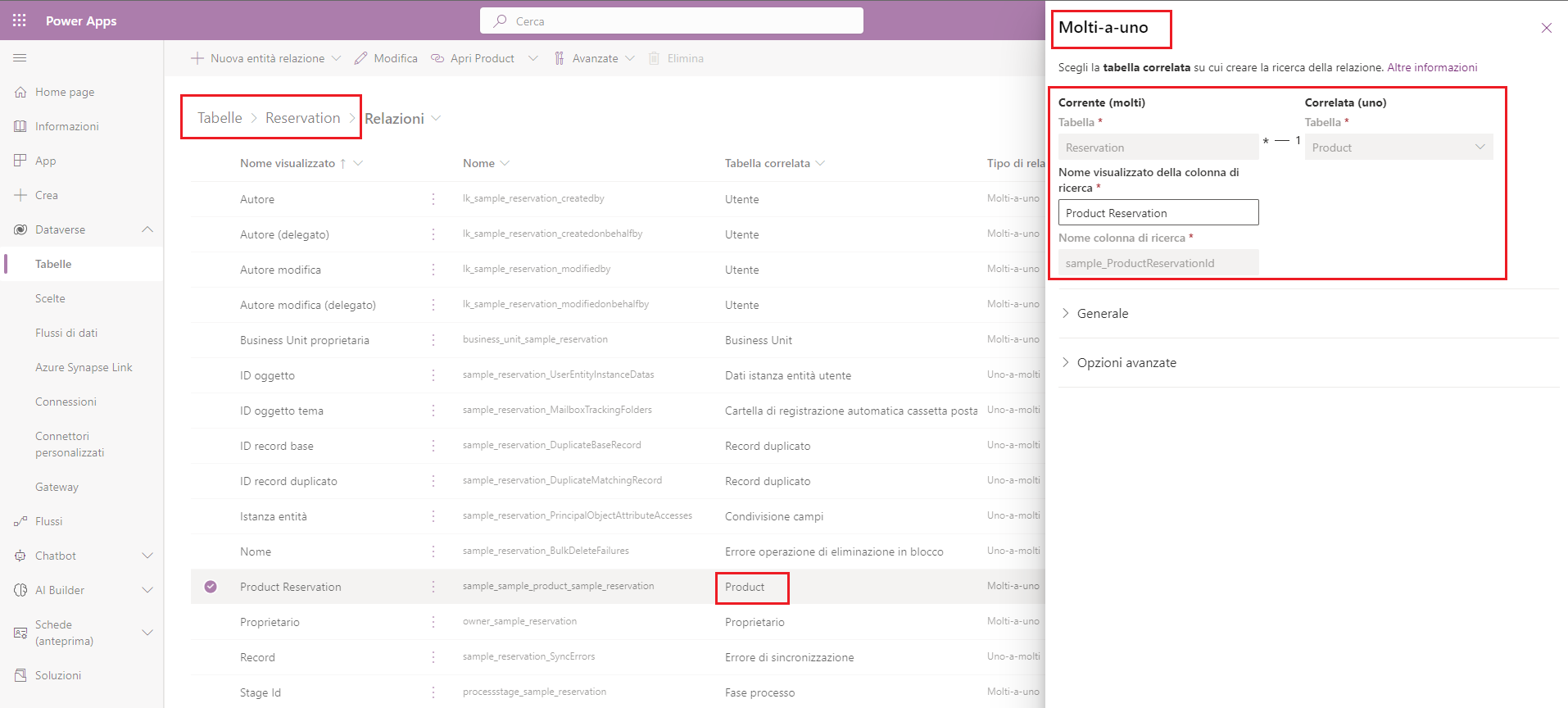 In modo analogo, viene stabilita una relazione molti-a-uno usando la colonna Prenotazione prodotti tra le tabelle Prenotazione e Prodotto.