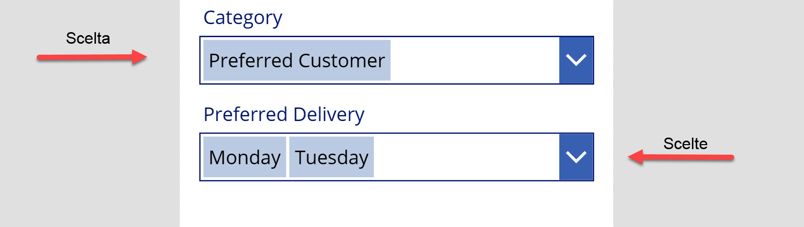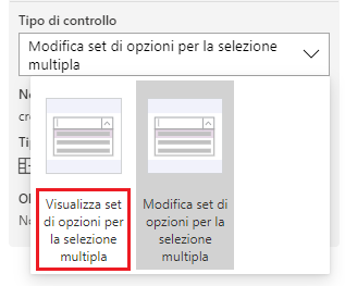 Impostare un menu a discesa (per una scelta singola) o una casella combinata (per scelte multiple). Quando si aggiunge un modulo di modifica, Power Apps specifica entrambe le impostazioni con una casella combinata.