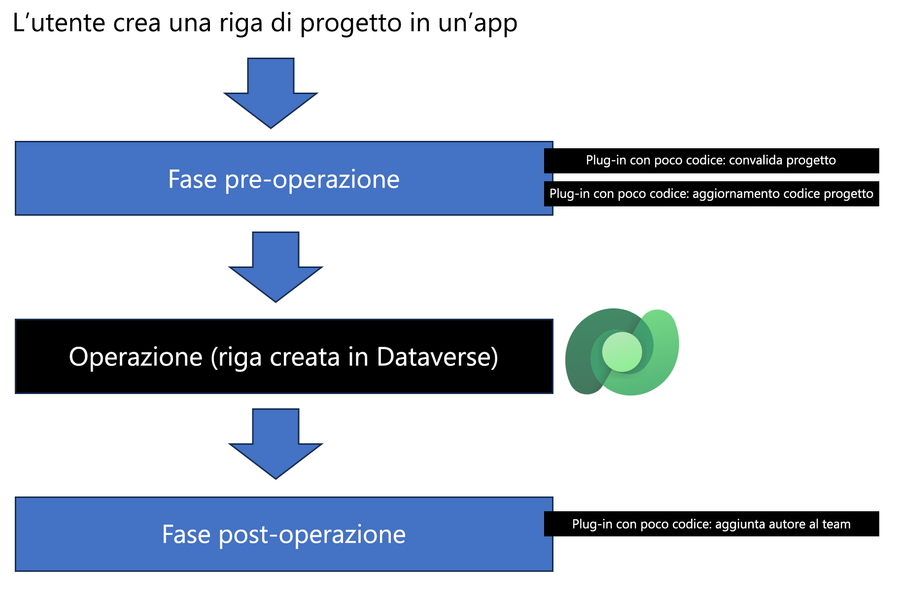 Per impostazione predefinita, la logica del plug-in viene eseguita dopo che si è verificato l'evento come post-operazione. Ad esempio, se si sceglie l'evento Creato, la logica viene eseguita dopo la creazione della riga in Dataverse. Questo evento è utile se si vogliono creare righe di dati correlate nel plug-in. Ad esempio, se il plug-in viene eseguito durante la creazione di righe nella tabella Progetto, la logica potrebbe aggiungere automaticamente l'utente che ha creato la riga come membro del team di progetto.