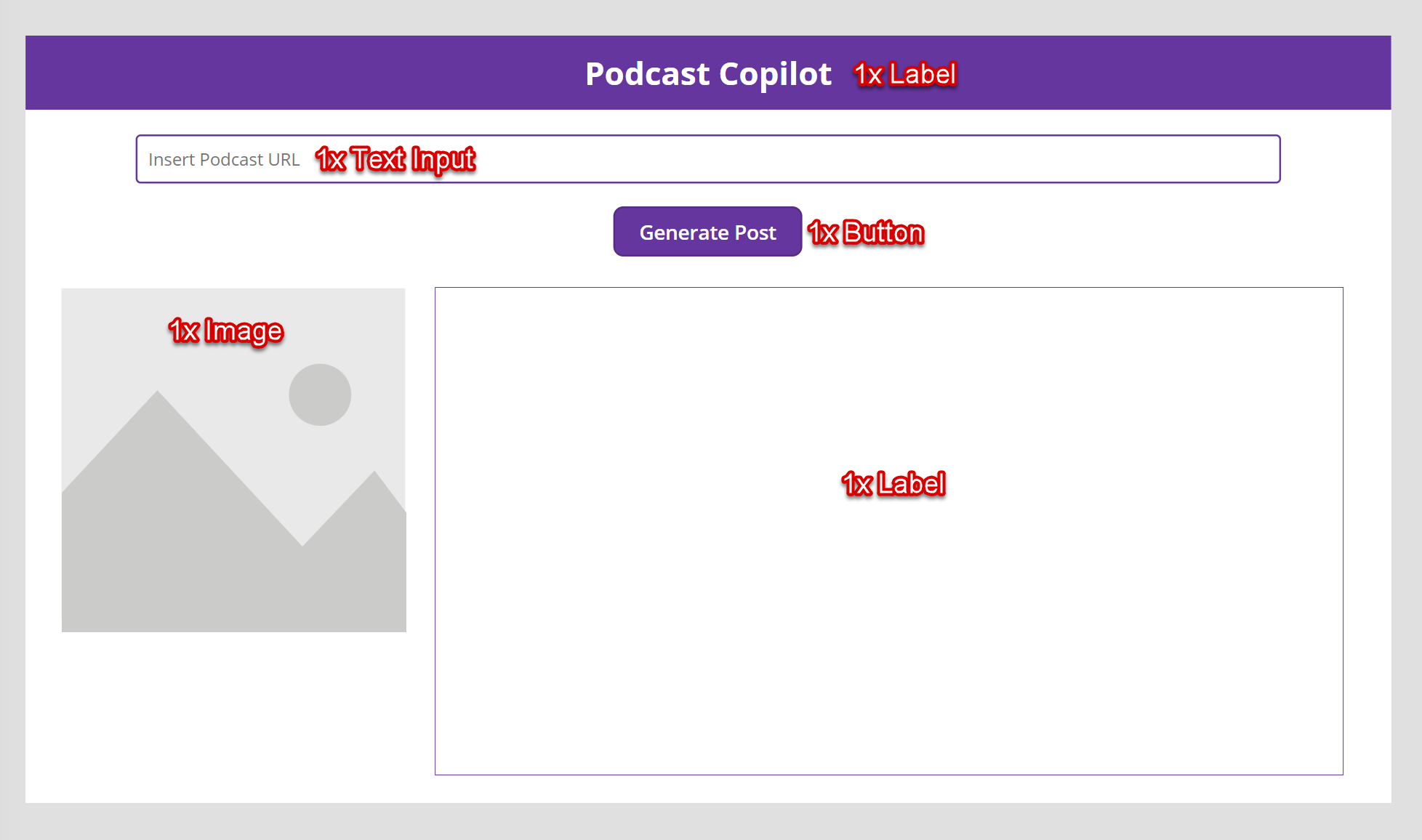 Usare il primo controllo Etichetta per il titolo dell'app. Usare il controllo Input di test per immettere il link all'URL del podcast. Il controllo Pulsante con il testo Genera post attiva il connettore personalizzato per generare il post e l'immagine sui social media. Il secondo controllo Etichetta visualizza il post generato, mentre il controllo Immagine visualizza l'immagine generata.