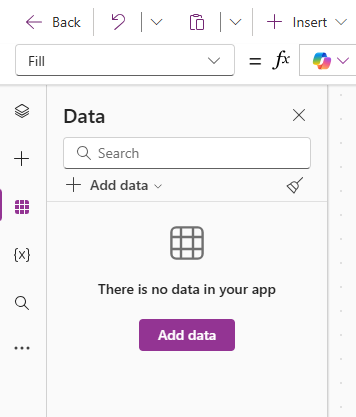 Dopo aver creato l'app, andare al riquadro di spostamento a sinistra e selezionare Dati > + Aggiungi dati.