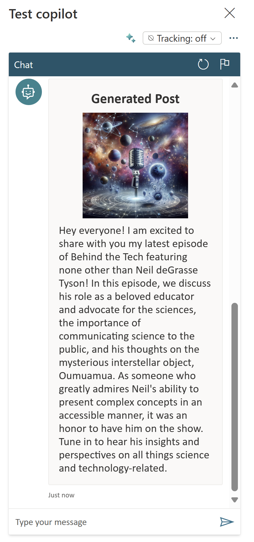 Dopo alcuni secondi, Copilot dovrebbe rispondere con il testo descrittivo e l'immagine sui social media dell'episodio del podcast, formattati in una scheda adattiva.