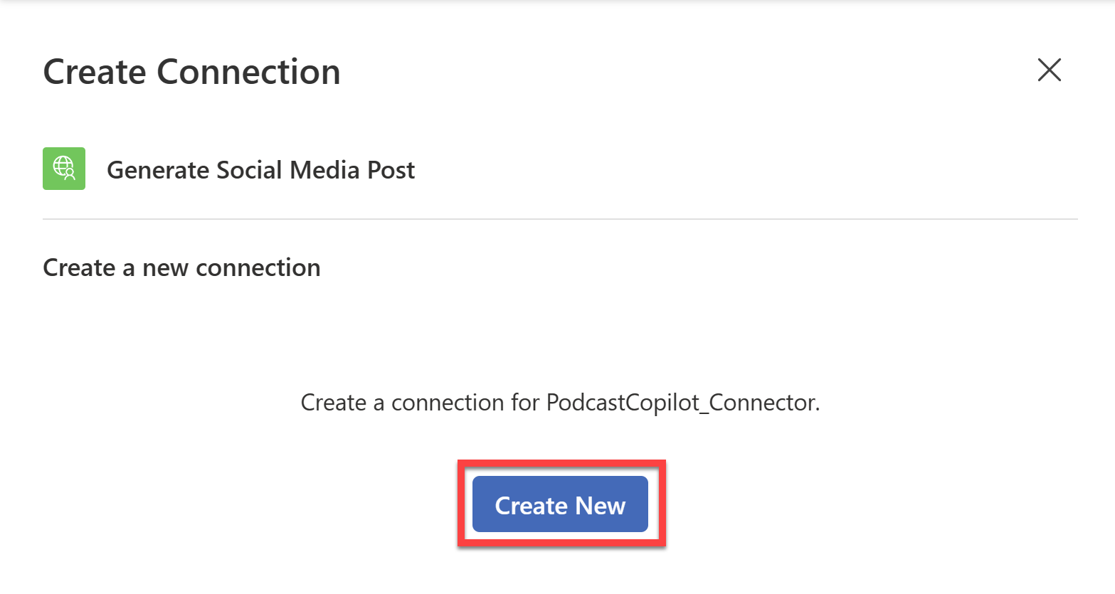 Creare una connessione a PodcastCopilot_Connector selezionando Crea nuovo.