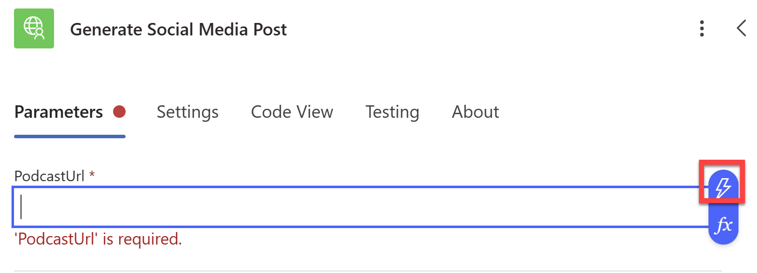 //Generate a social media blurb / post Set( socialMediaBlurb, PodcastCopilot_Connector.GetSocialMediaPost(txtPodcastURL.Text).blurb ); //Generate a social media image Set( socialImage, PodcastCopilot_Connector.GetSocialMediaPost(txtPodcastURL.Text).imageUrl );Questa formula chiama la singola operazione API nel connettore personalizzato e restituisce un record post sui social media con un testo descrittivo e un URL dell'immagine. Il sistema archivia il testo descrittivo per i social media risultante in una variabile socialMediaBlurb e archivia l'immagine risultante in una variabile socialImage.
