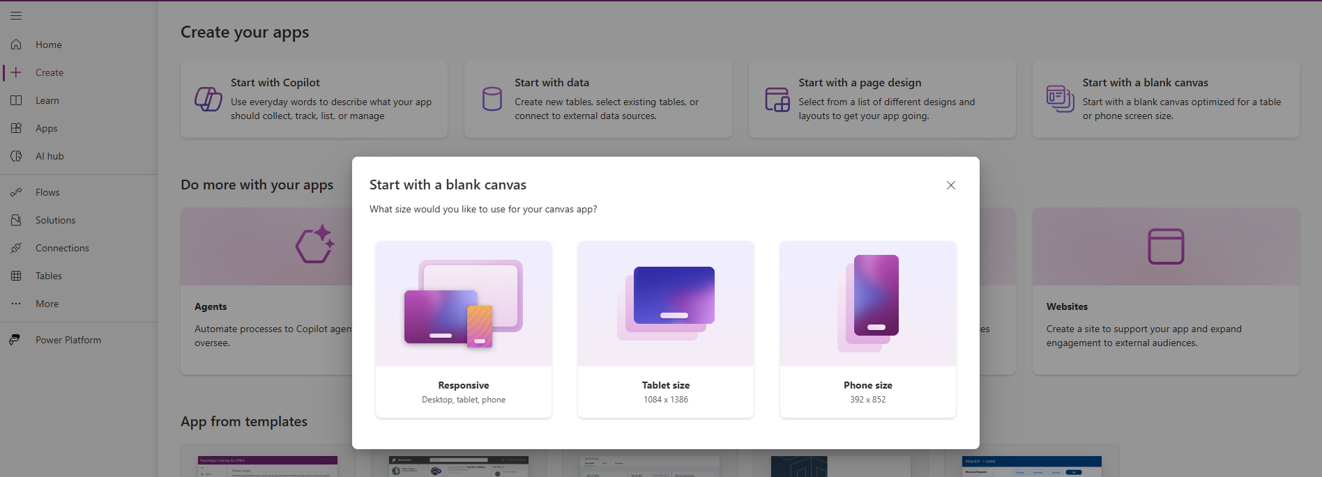Selezionare + Crea nel riquadro di spostamento a sinistra e selezionare Inizia con un canvas vuoto.