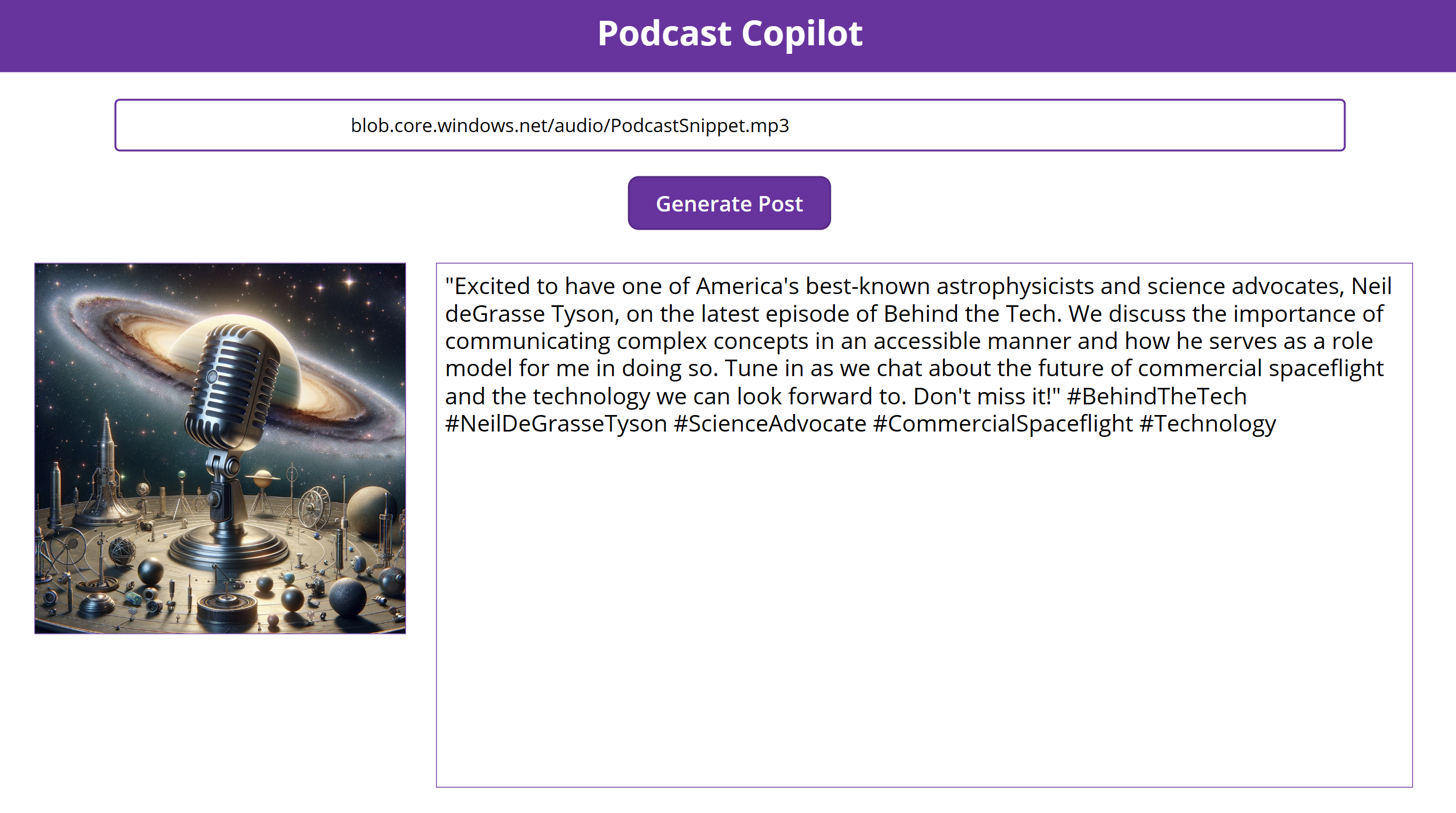 Usare il pulsante Anteprima per testare l'app. Nel controllo Input di testo immettere il collegamento all'episodio del podcast (l'URL del BLOB copiato nell'esercizio Configurazione del Servizio OpenAI di Azure per generare informazioni sul podcast). Selezionare il pulsante Genera post. Dovrebbero essere visibili il testo descrittivo e l'immagine per i social media (entrambi univoci).
