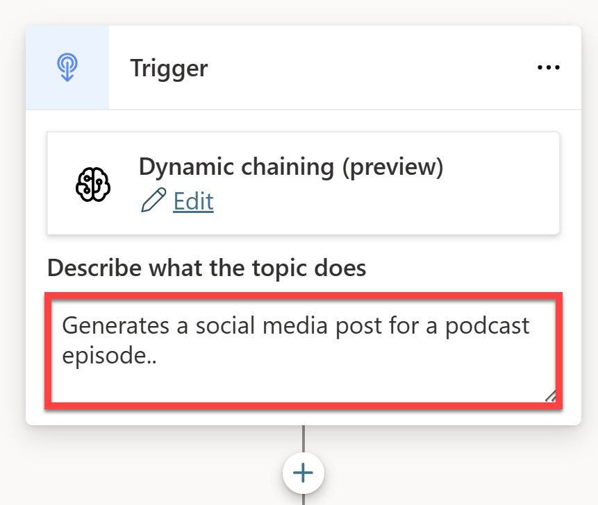 Nella descrizione Trigger immettere Genera un post sui social media per un episodio del podcast.