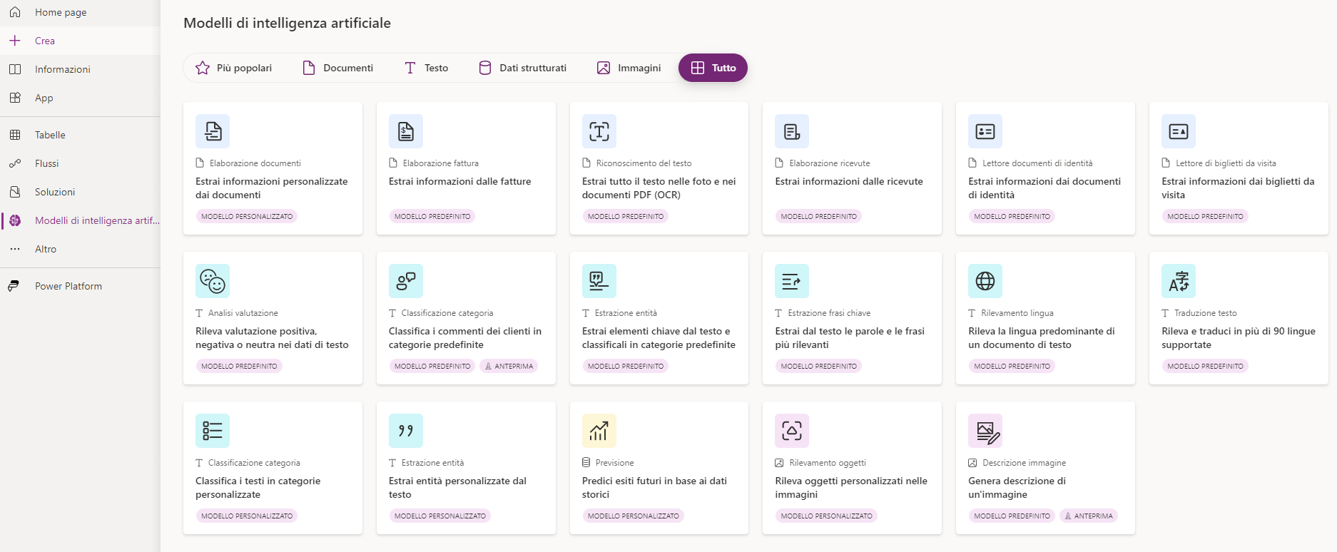 Le soluzioni IA sono disponibili in Microsoft Power Platform attraverso gli strumenti di AI Builder e Microsoft Copilot Studio. Si tratta, tuttavia, solo di un piccolo sottoinsieme delle funzionalità disponibili in Azure OpenAI. I componenti disponibili direttamente in Microsoft Power Platform includono: