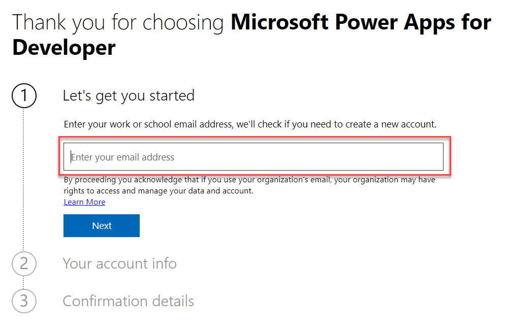 Per il Passaggio 1, inserire l'indirizzo e-mail del Programma per sviluppatori di Microsoft 365 (l'indirizzo e-mail amministratore).