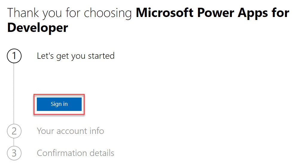 Accedere al proprio account Microsoft usando lo stesso account amministratore usato per creare il piano per sviluppatori di Power Apps.