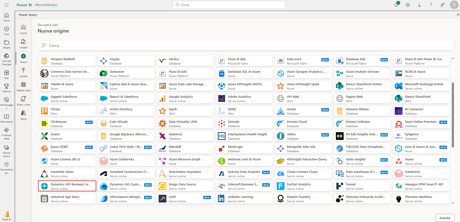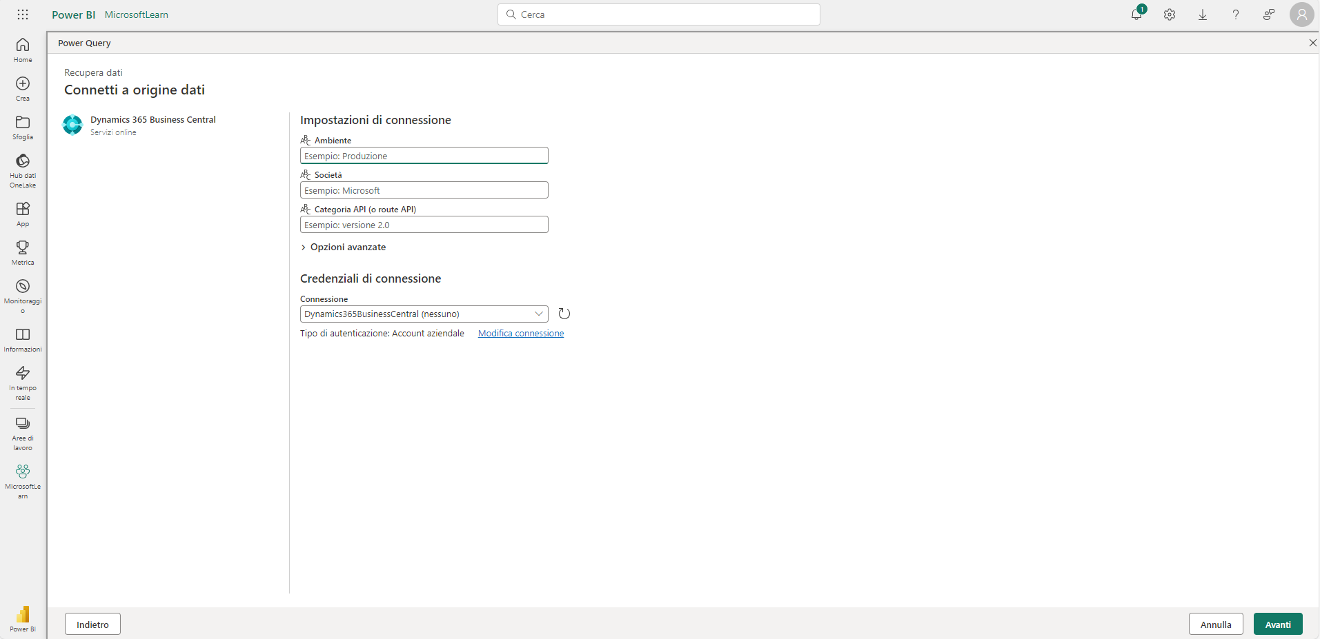 Per creare un flusso di dati Power BI che si connette ai dati di Business Central, effettuare i seguenti passaggi: