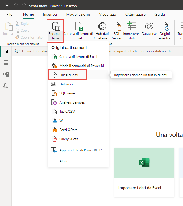 In Power BI Desktop selezionare Recupera dati, Flussi di dati.