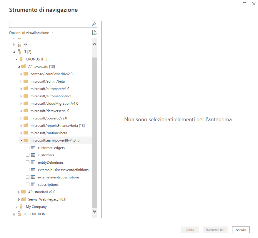 Come si può notare, le API personalizzate sono disponibili in API avanzate nel connettore Business Central in Power BI Desktop.