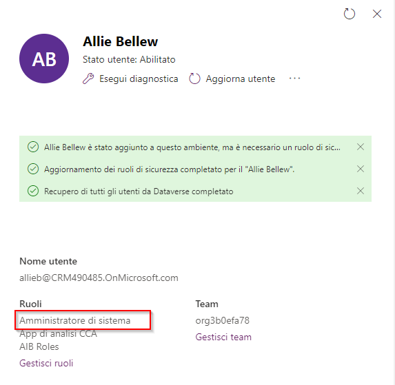Screenshot dell'assegnazione del ruolo Amministratore di sistema.