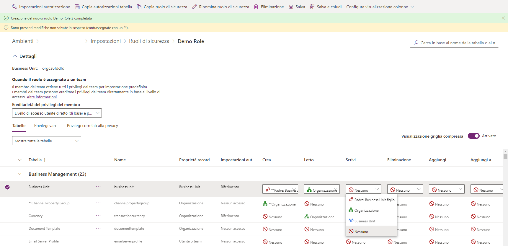 Screenshot del ruolo di sicurezza: impostazioni del nuovo ruolo di sicurezza per ogni entità.