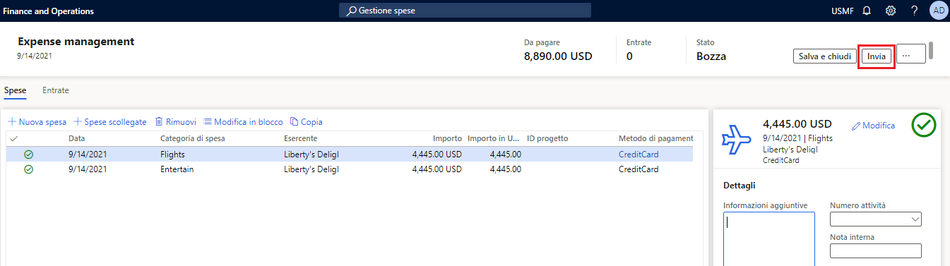 Dopo aver immesso tutte le righe nella nota spese e aver allegato le ricevute nel rispetto dei criteri aziendali, è necessario inviare la nota spese a un flusso di lavoro procedendo come illustrato di seguito.