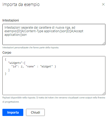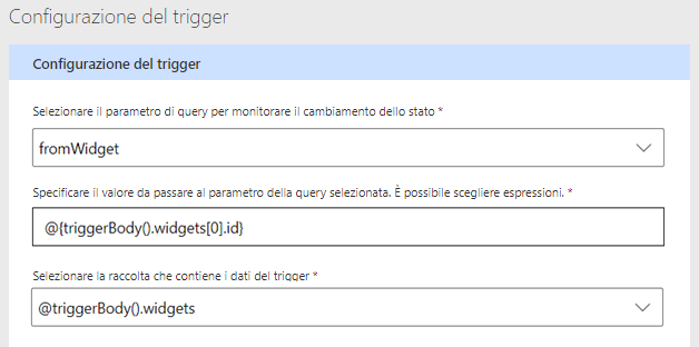 L'espressione @triggerBody().widgets definisce la raccolta dei dati.