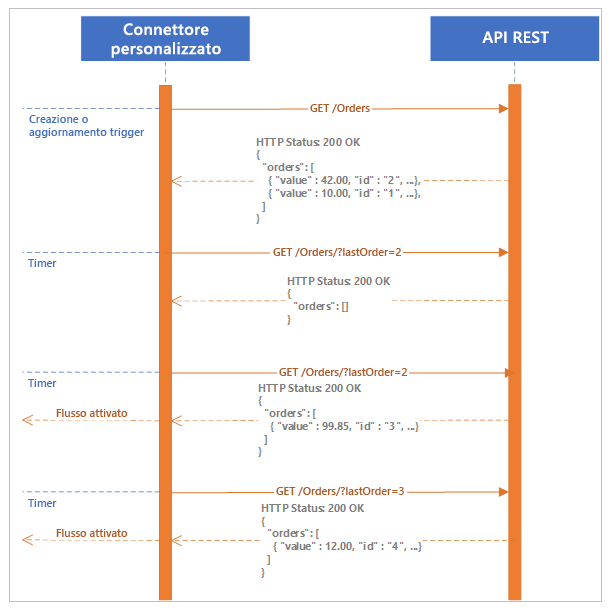 Un trigger di polling per prima cosa recupera i dati e imposta uno stato. Quindi, controlla periodicamente la presenza di aggiornamenti richiedendo tutti i dati dopo l'ultimo aggiornamento dello stato. Dopo che i nuovi dati sono stati recuperati, il nuovo stato viene impostato e il processo continua. L'API deve essere in grado di restituire i dati in modo incrementale, in base al valore di un parametro. Power Automate oppure App per la logica di Azure gestisce lo stato in modo che l'API non abbia requisiti speciali per la gestione dello stesso.