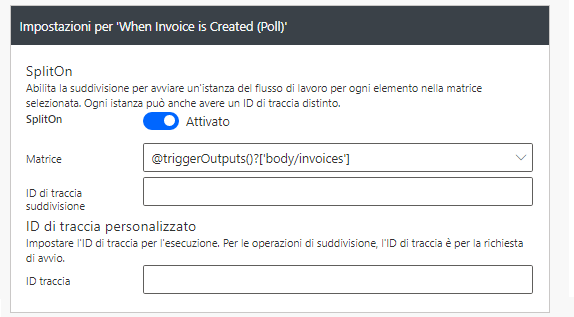 Questo processo si verifica perché è possibile avere più record restituiti da una singola chiamata al servizio. Quando viene usato un trigger di polling in Power Automate o in App per la logica, l'impostazione SplitOn del trigger consente di configurare la modalità di elaborazione.