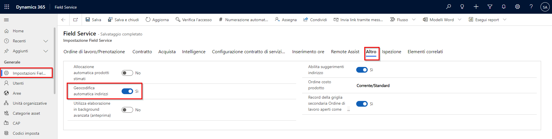 L'impostazione può essere modificata per applicare automaticamente la geocodifica degli indirizzi nell'app Field Service. Per abilitare la geocodifica automatica, andare a Impostazioni > Generale > Impostazioni assistenza sul campo, selezionare la scheda Altro e impostare Geocodifica automatica indirizzi su Sì.