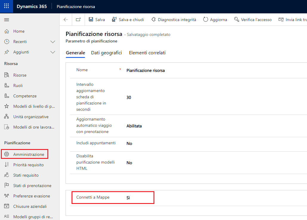 È possibile connettersi alle mappe anche dall'app Field Service andando a Risorse > Amministrazione > Parametri di pianificazione.