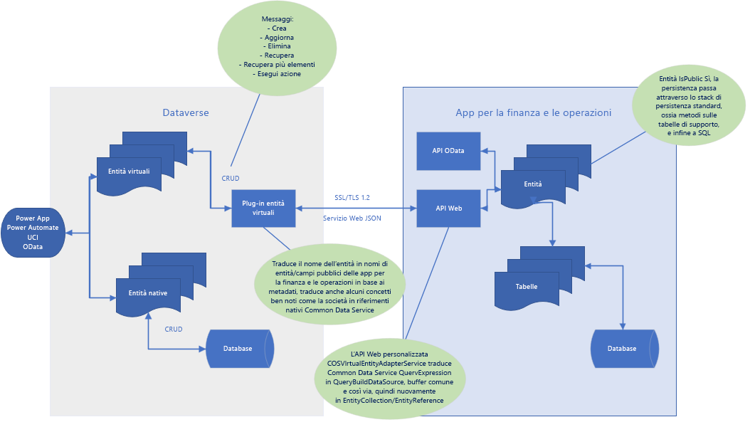 Nelle app per la finanza e le operazioni è possibile usare entità virtuali come origini dati virtuali in Microsoft Dataverse. Di conseguenza, è possibile eseguire operazioni di creazione, lettura, aggiornamento ed eliminazione (CRUD) da Dataverse e Microsoft Power Platform.